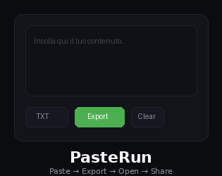 PasteRun lets you paste any text or code and instantly export it as TXT, PDF, or HTML — no login, no upload, everything runs locally in your browser.